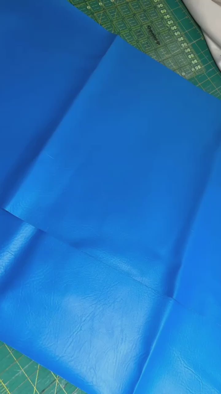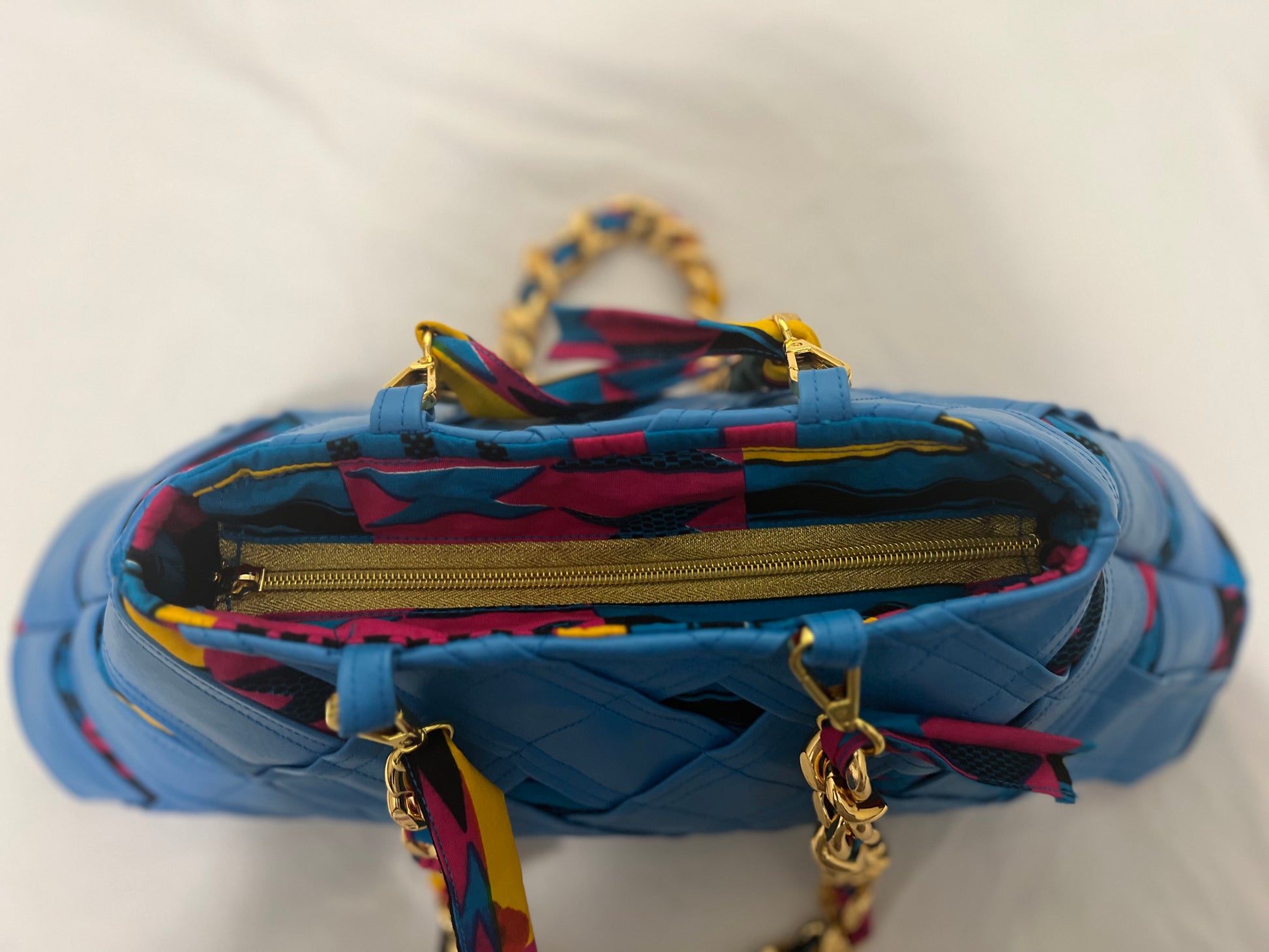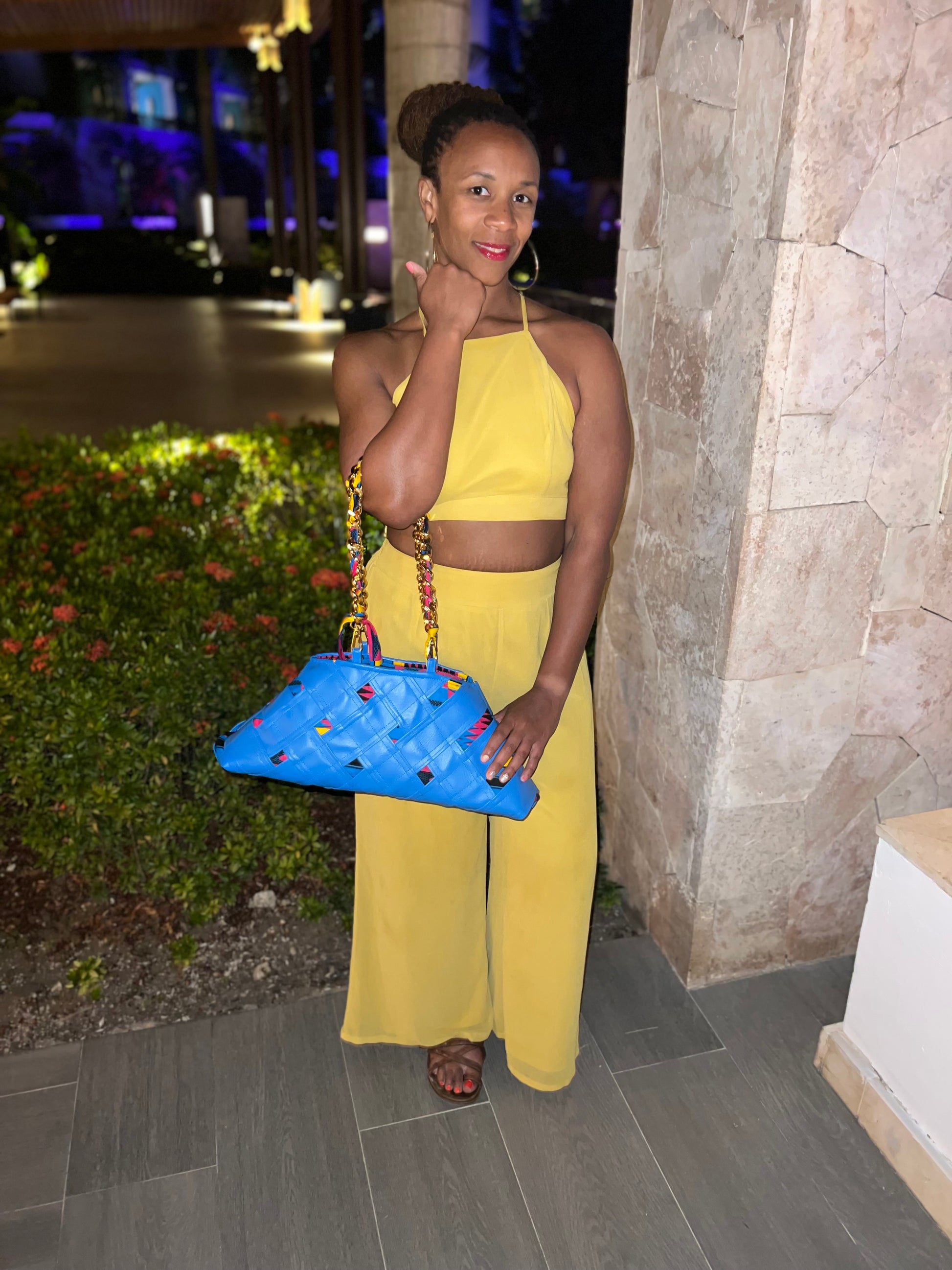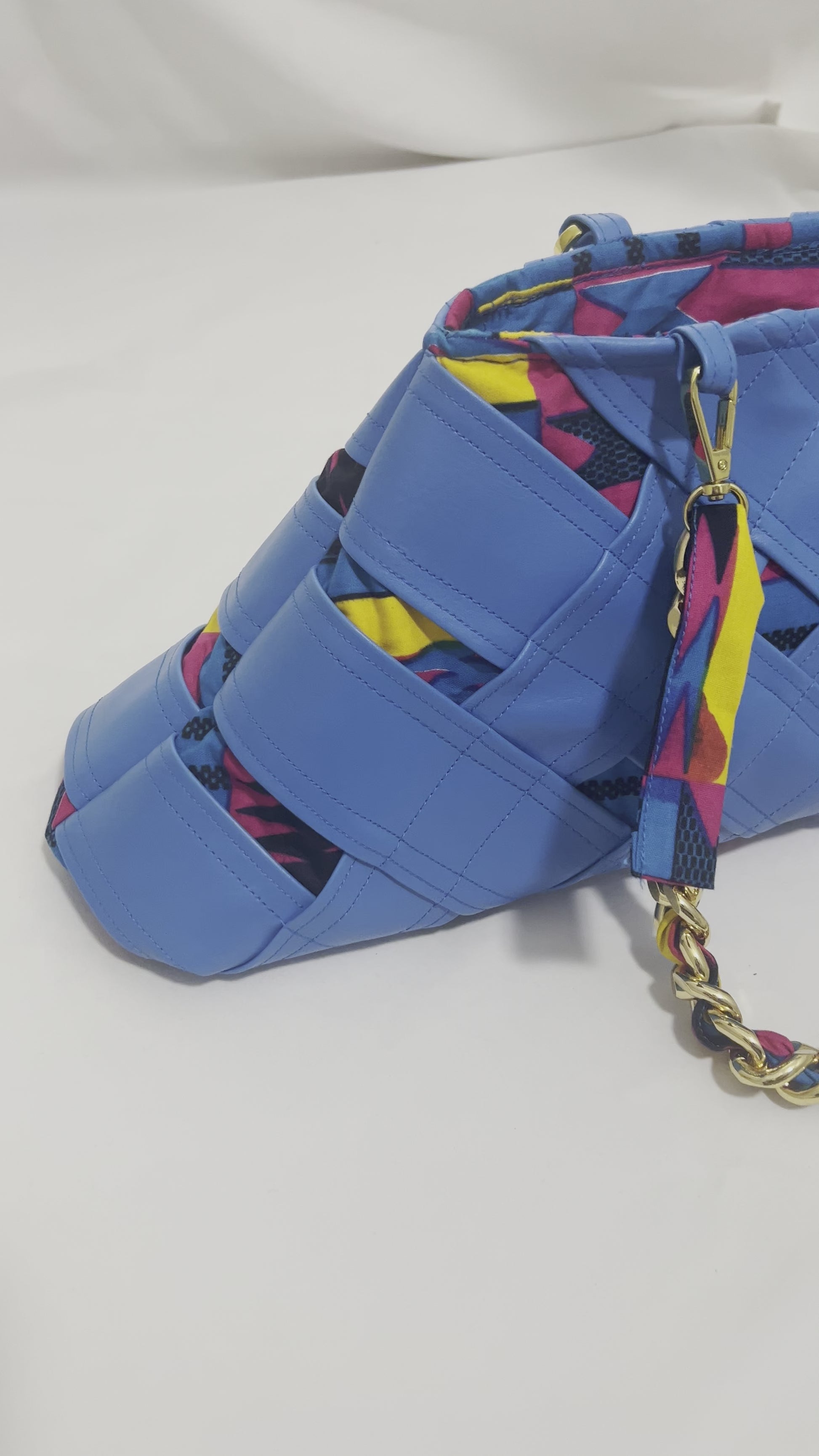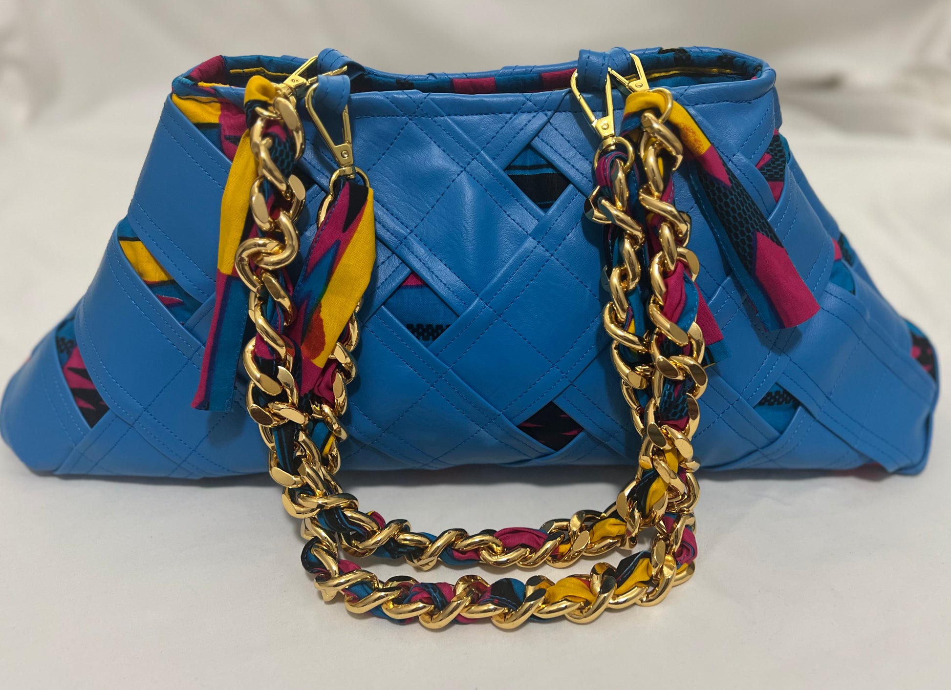 Materials: Vibrant blue marine vinyl and a pop of bright kente cloth (outside), colorful kente cloth (inside), and chunky polished aluminum chained handles/straps.
