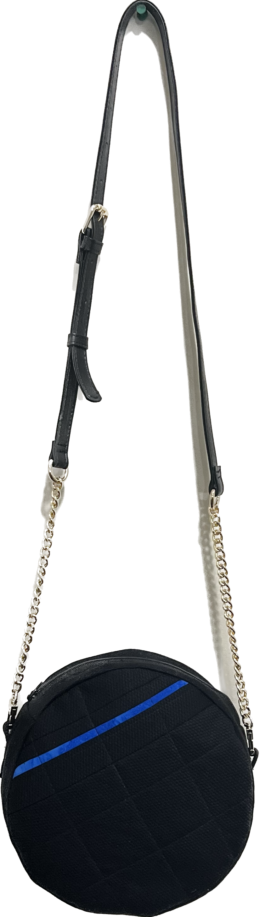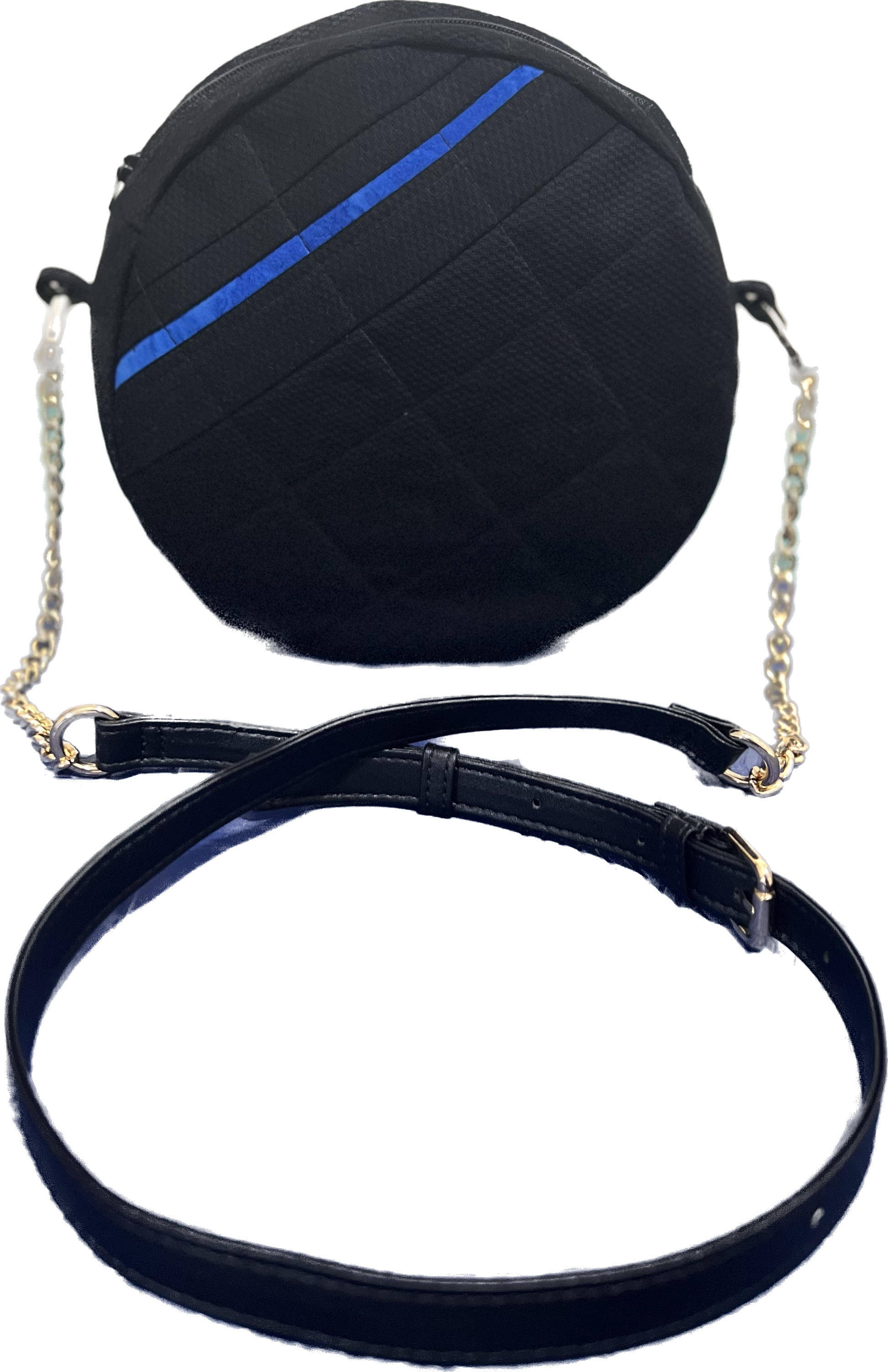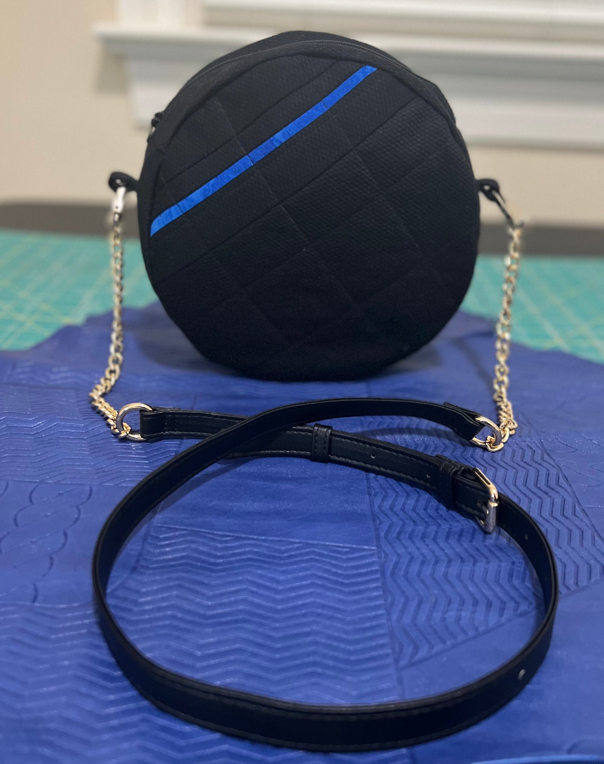 Materials: Cotton black and blue fabric (outside), blue cotton fabric (inside), and genuine leather adjustable strap.