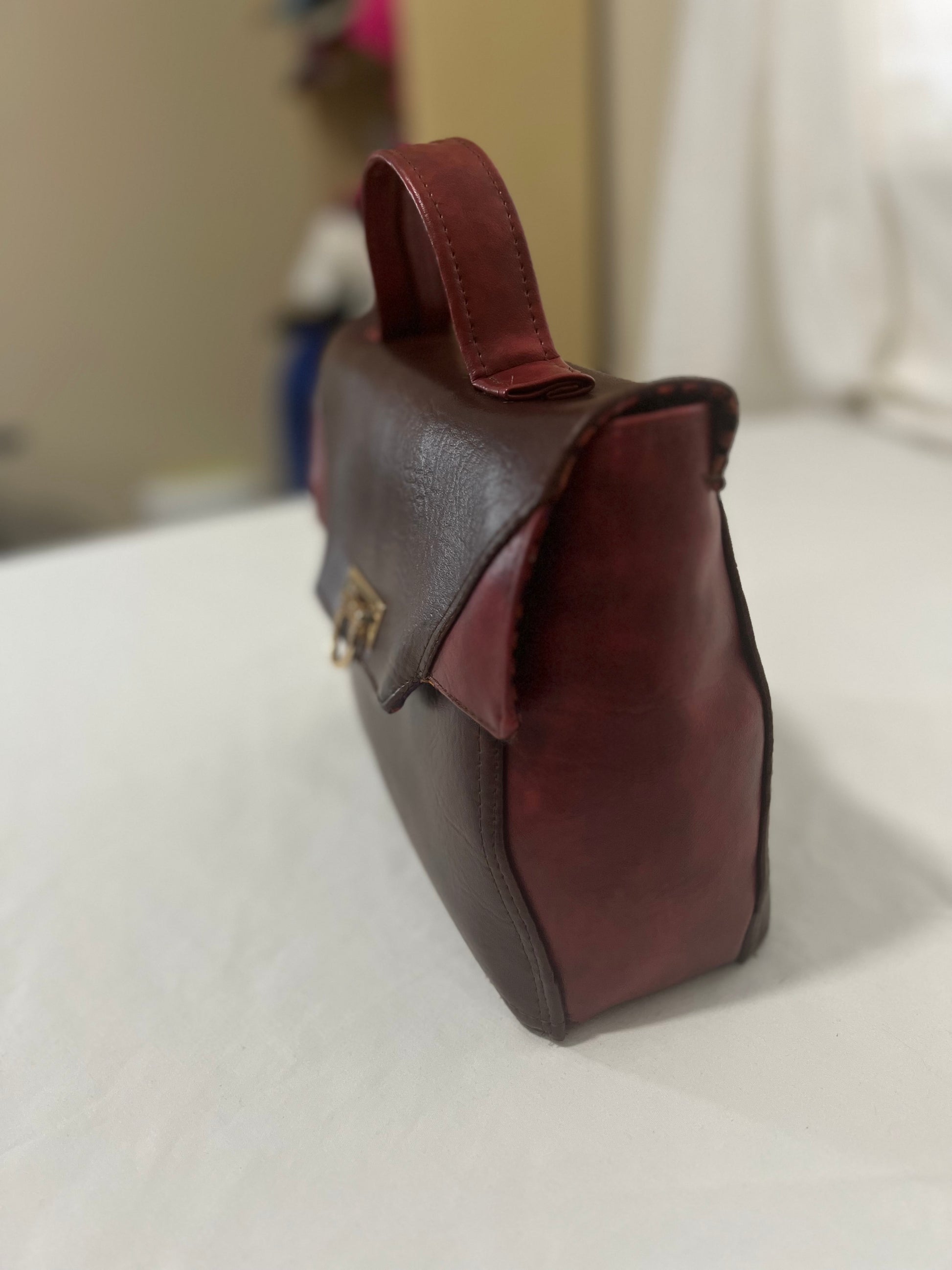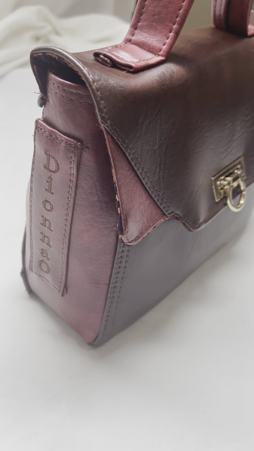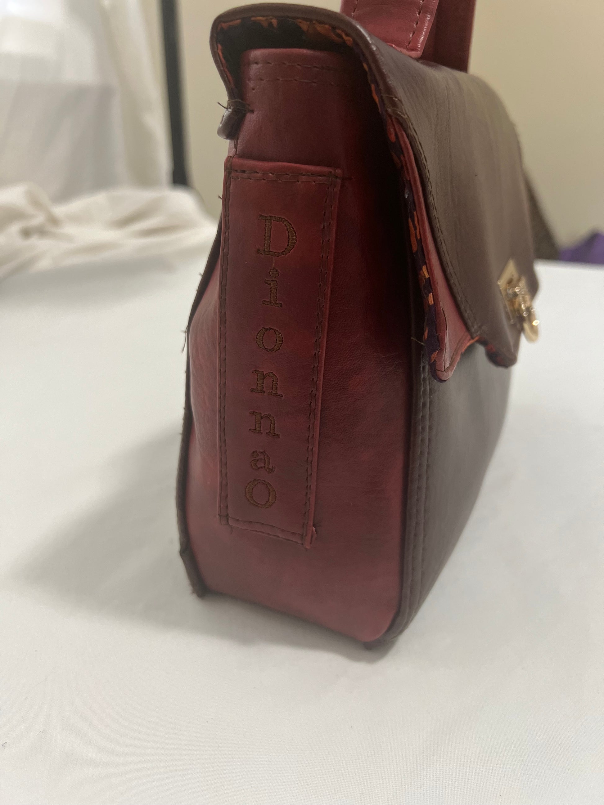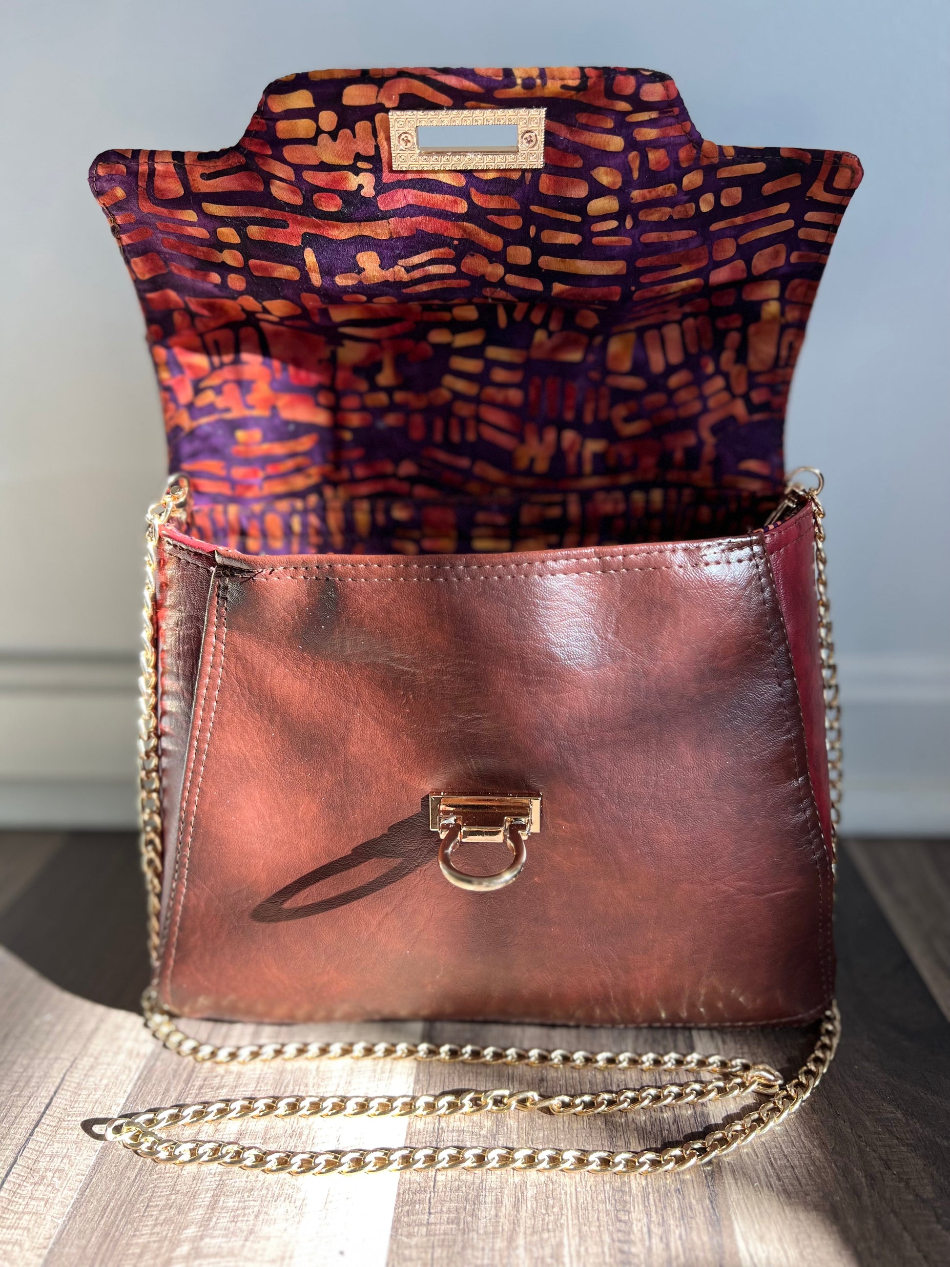 Materials: Dark brown and maroon vinyl fabric on the outside, batik fabric with a zipper pocket on the inside, and chain strap.