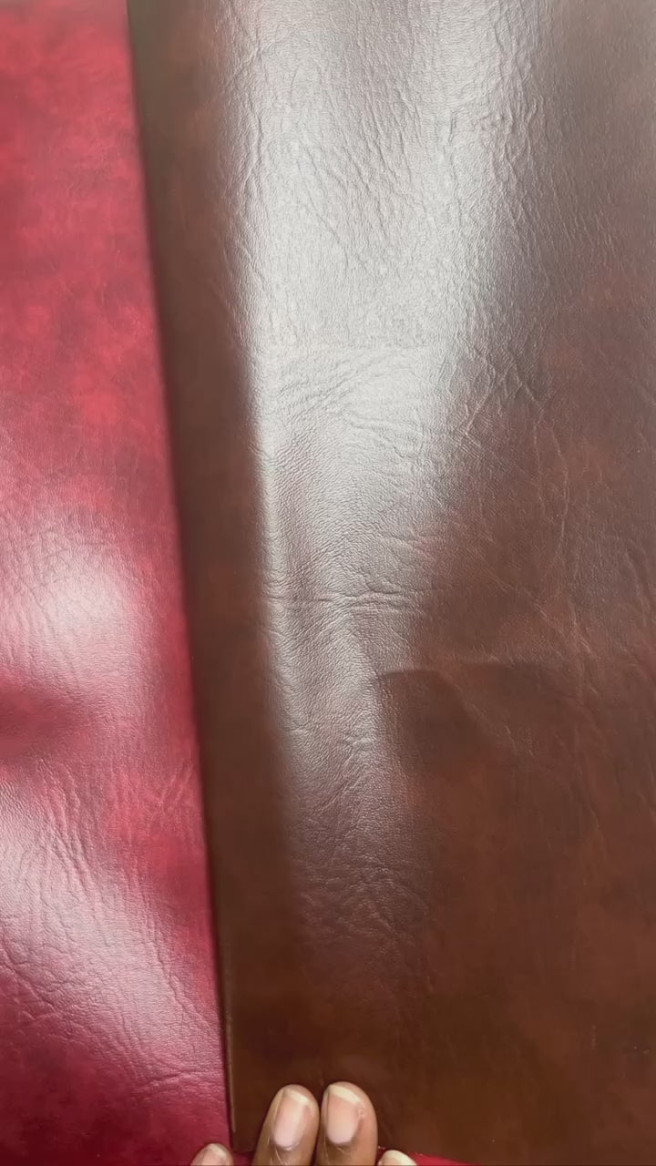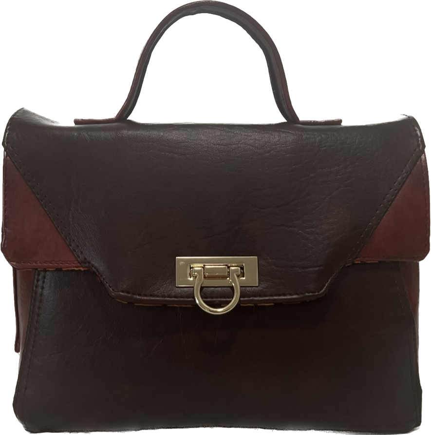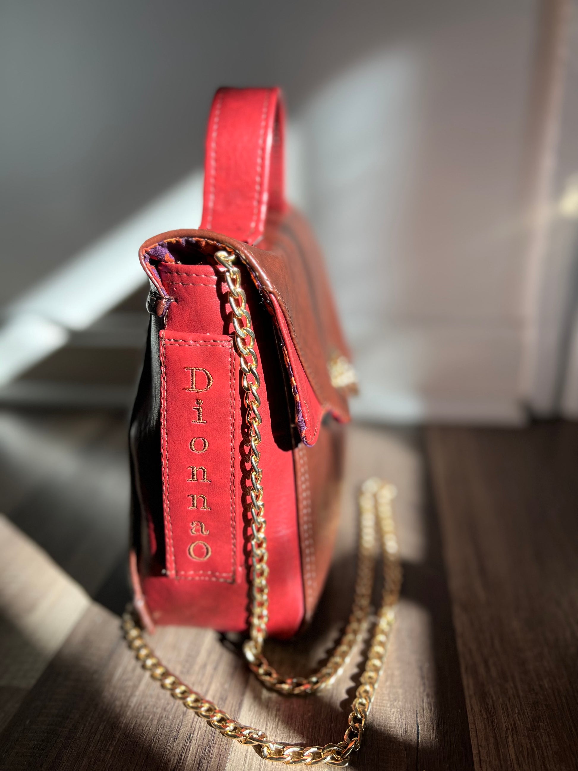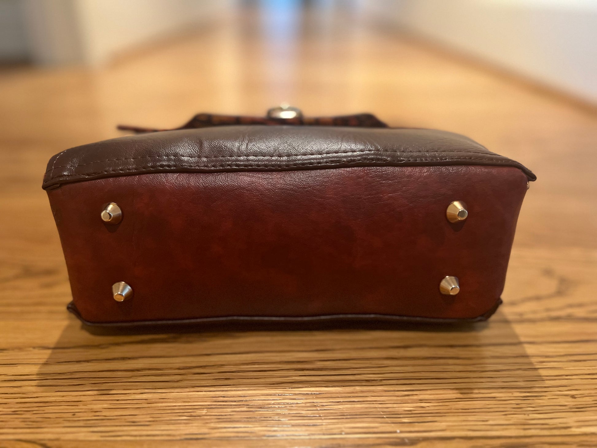 Materials: Dark brown and maroon vinyl fabric on the outside, batik fabric with a zipper pocket on the inside, and chain strap.