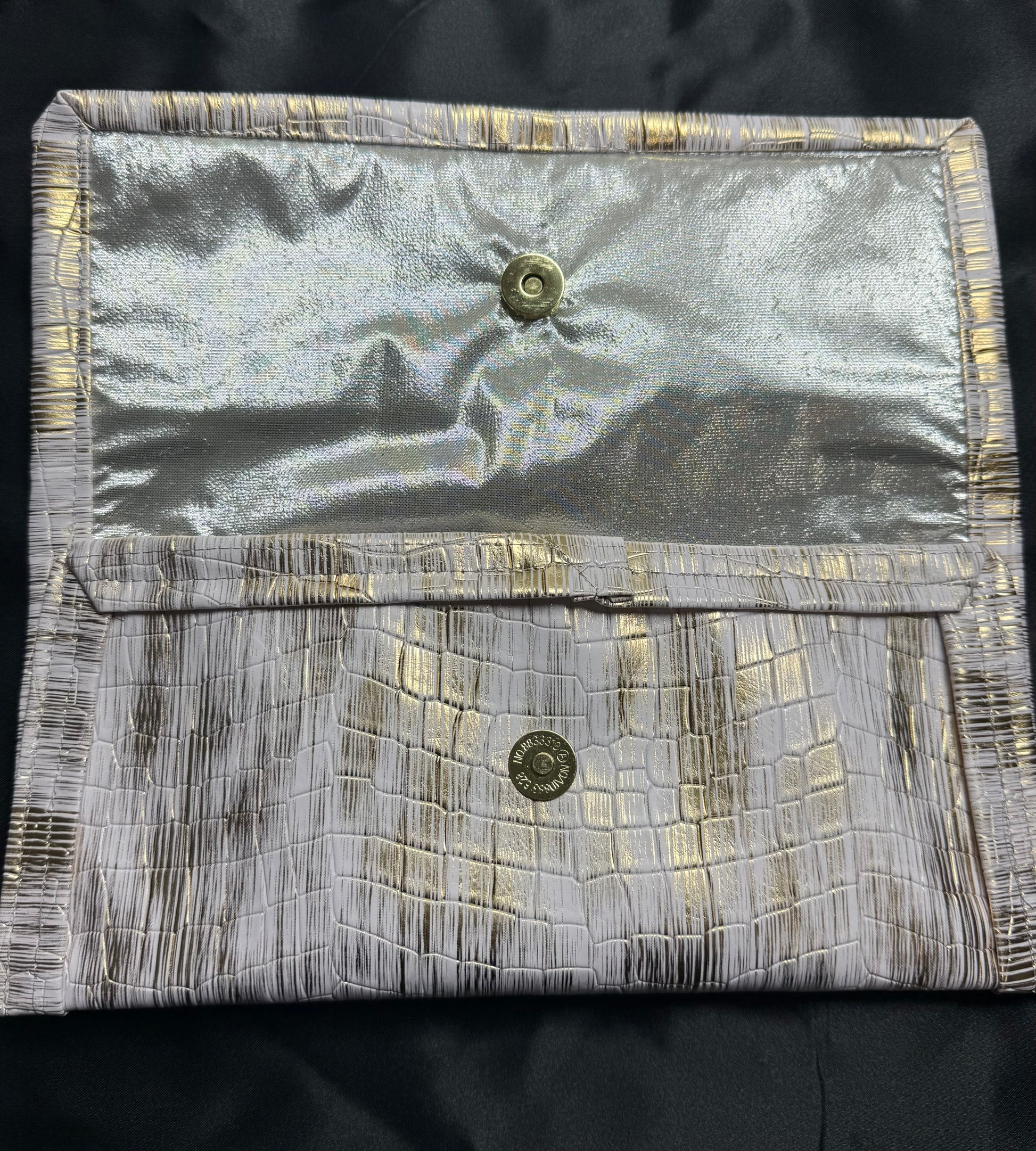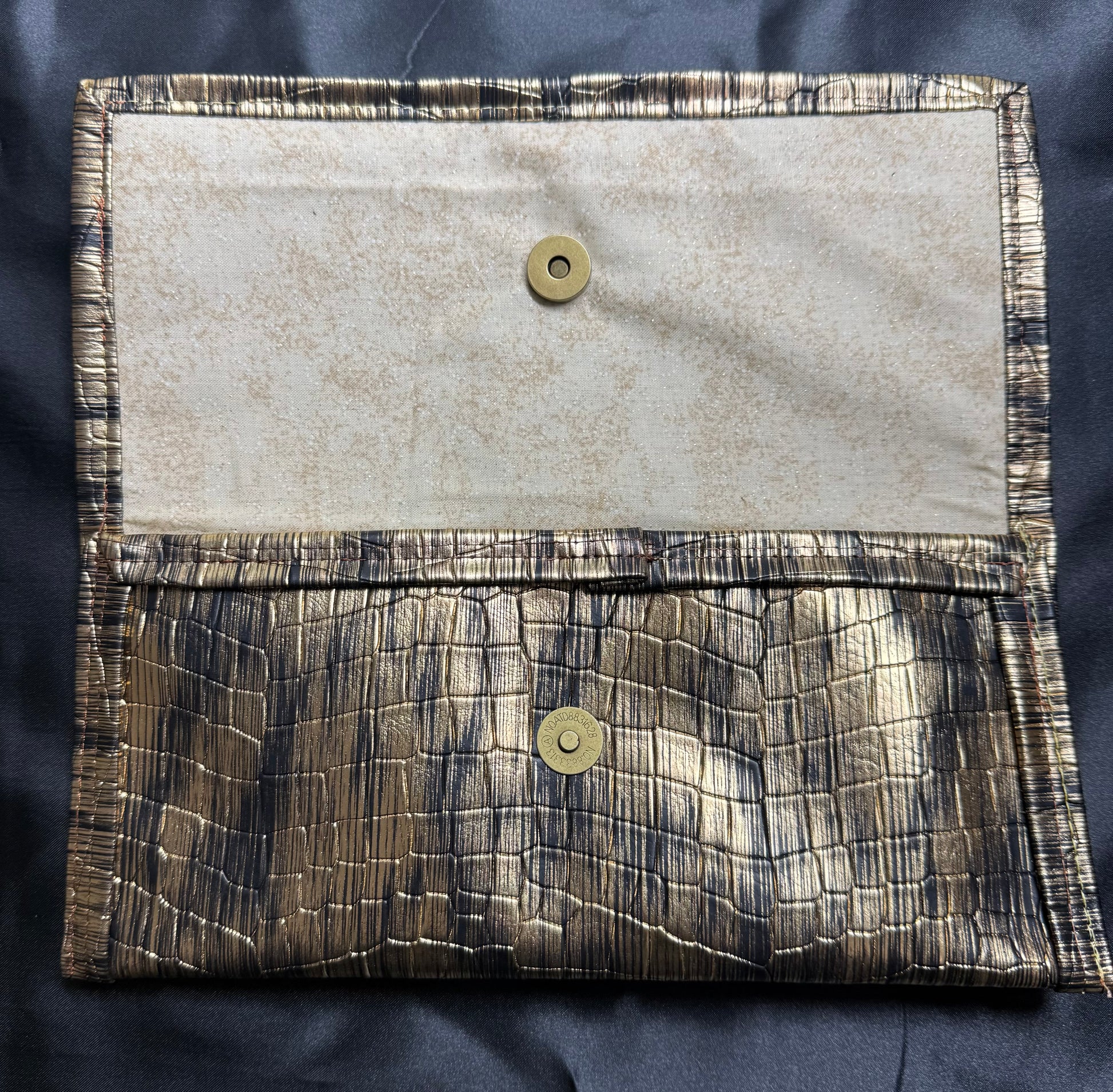 Materials: Vinyl fabric (outside), zipper pocket and card holders (inside), and finished with a snap closure.