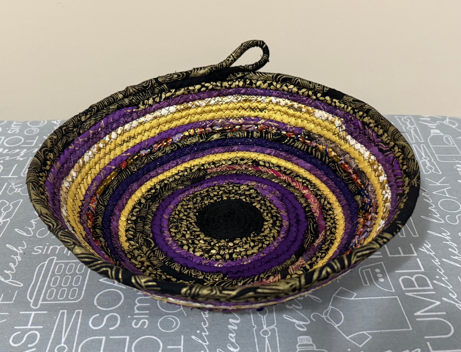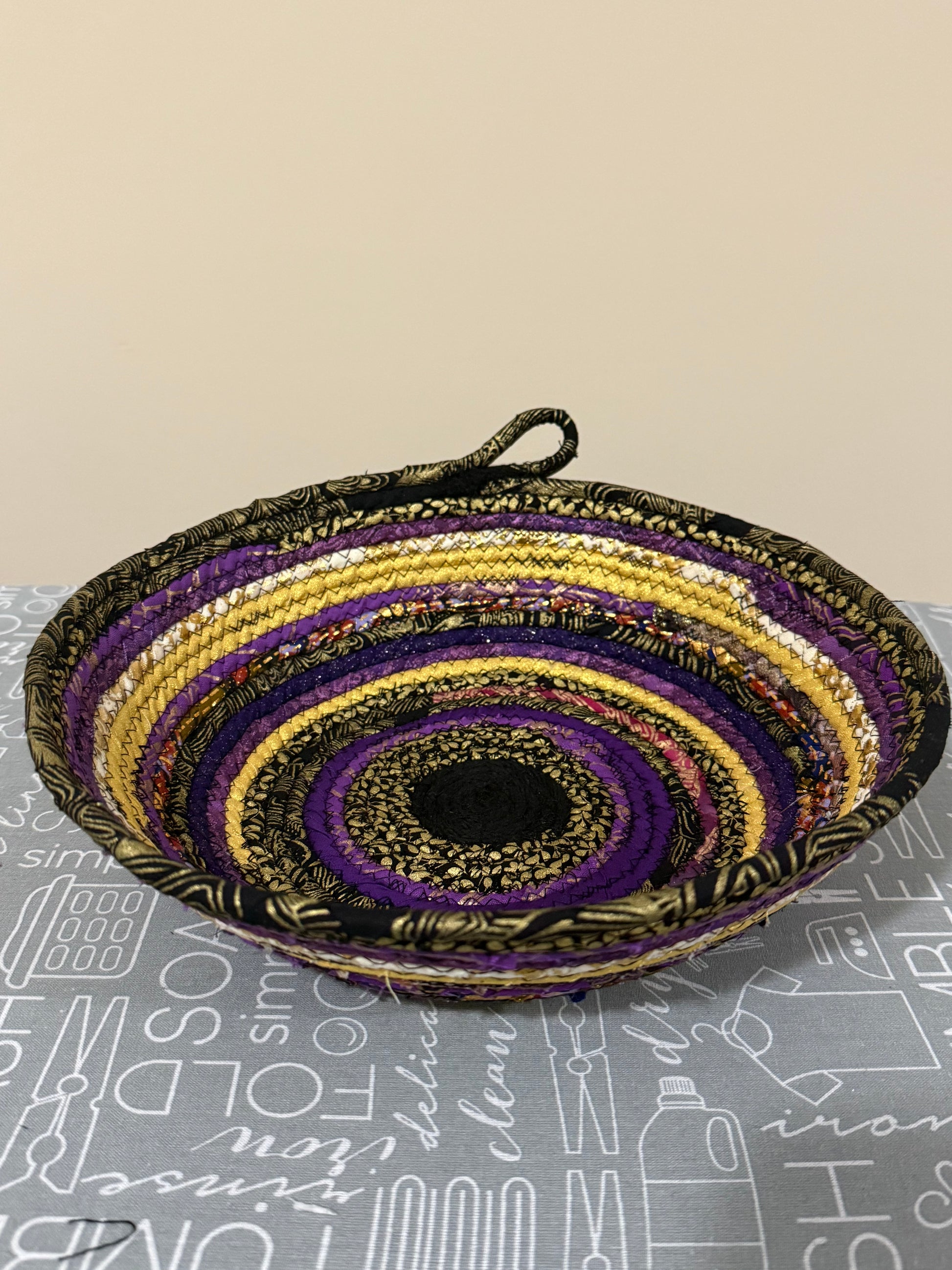 Elevate your decor with this exquisite handmade rope basket, artfully woven with rich purple, gold, and black fabrics. Its sophisticated design adds a timeless charm, making it perfect for stylish storage or as a statement piece in any room. Crafted with care, this basket is elegantly made to enhance your living space.