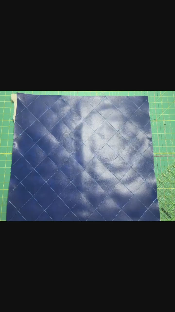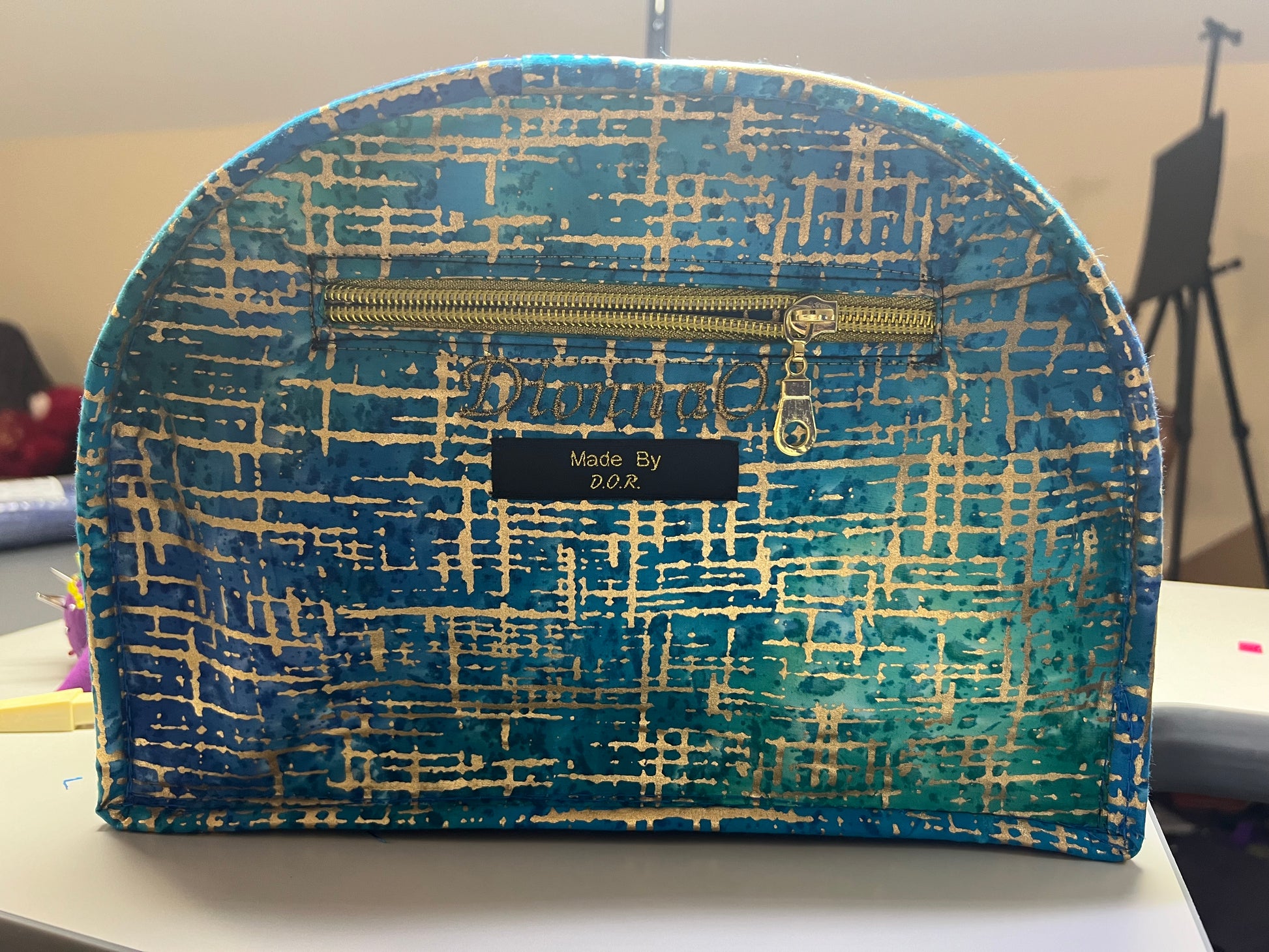 Materials: vinyl (outside), cotton fabric (inside), adjustable strap, and zipper.