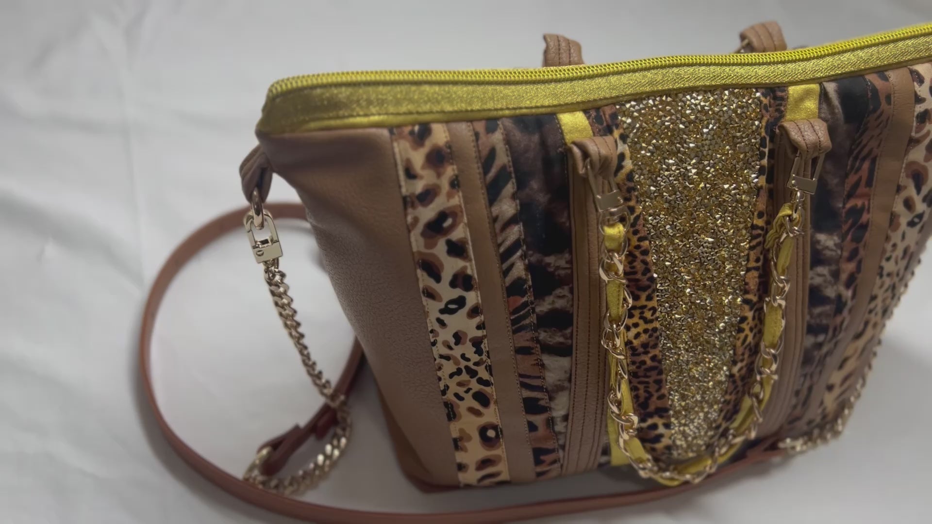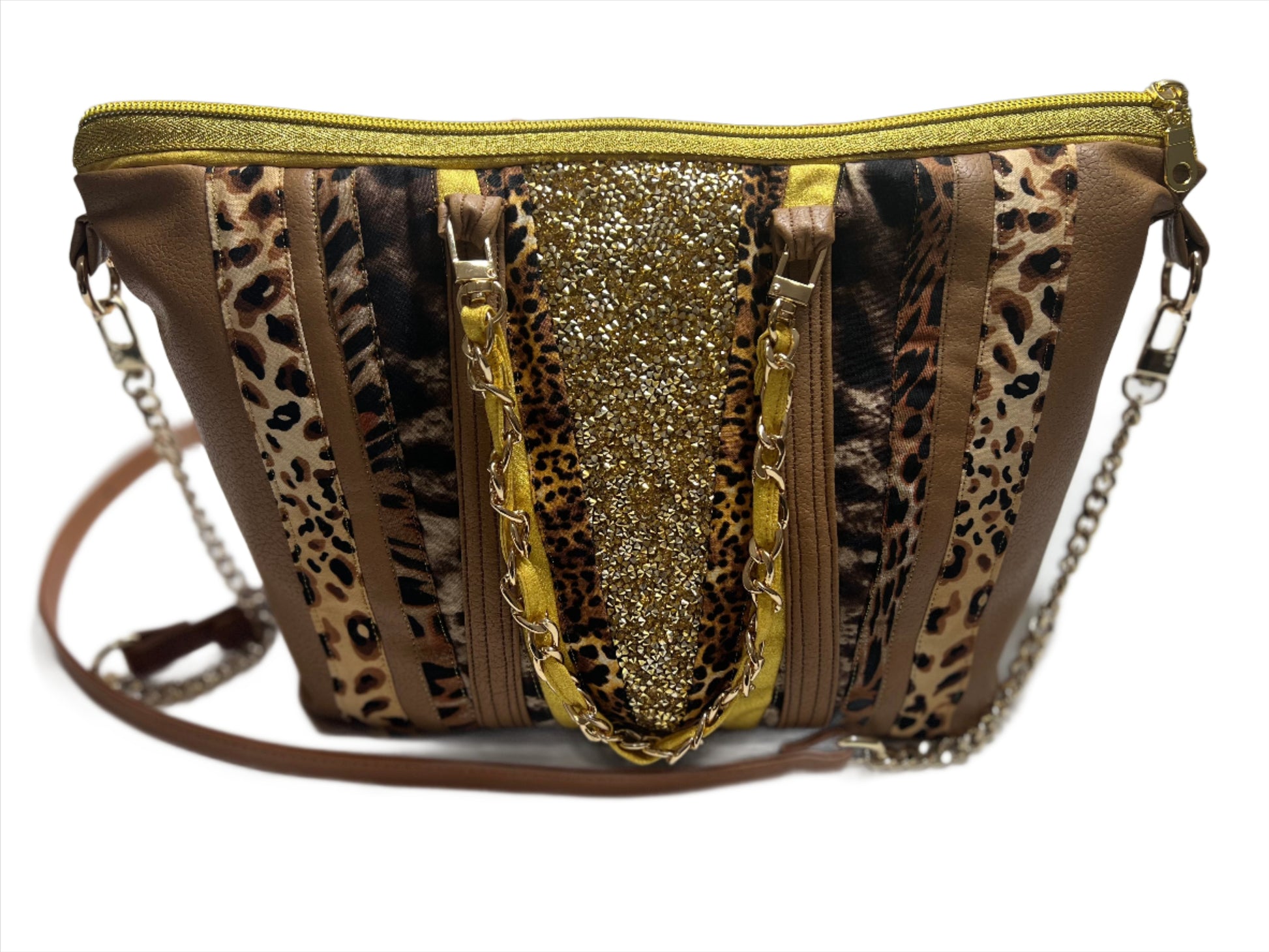 This custom purse is handmade with a soft brown vinyl fabric, accented textured gold fabric, and animal print cotton fabric. Unique and fabulous!